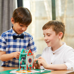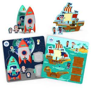 Embark on two epic adventures in one exciting bundle! The Spaceship and Pirate Ship Pop-Together Playworlds start as colorful Build Sheets—each filled with sturdy, press-fit pieces that kids can easily pop out and assemble. In just a few steps, children create detailed 3D playsets ready for cosmic missions or high-seas quests.