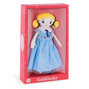 A fairytale favorite, reimagined for play and display. This 14” soft plush Goldilocks Doll is crafted from premium cotton and dressed in her classic blue dress with delicate tulle accents and a crisp white collar. Her sweet embroidered face, bright blonde pigtails, and soft huggable body make her irresistible to both kids and collectors.