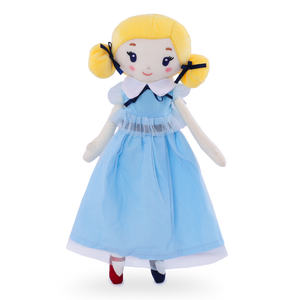 • 14” Limited Edition Goldilocks Doll – Soft cotton body, classic blue dress with tulle accents, embroidered face, blonde pigtails, and a beautiful pink gift box