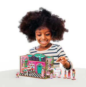 Kids build their own storybook playset before the adventure begins! Our patented press-fit design keeps every piece snugly in place until it’s time to pack up. Made from soft, durable EVA foam like yoga mats, it’s hands-on, screen-free play that builds creativity and confidence.